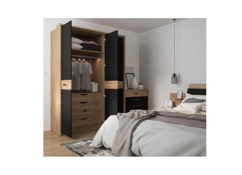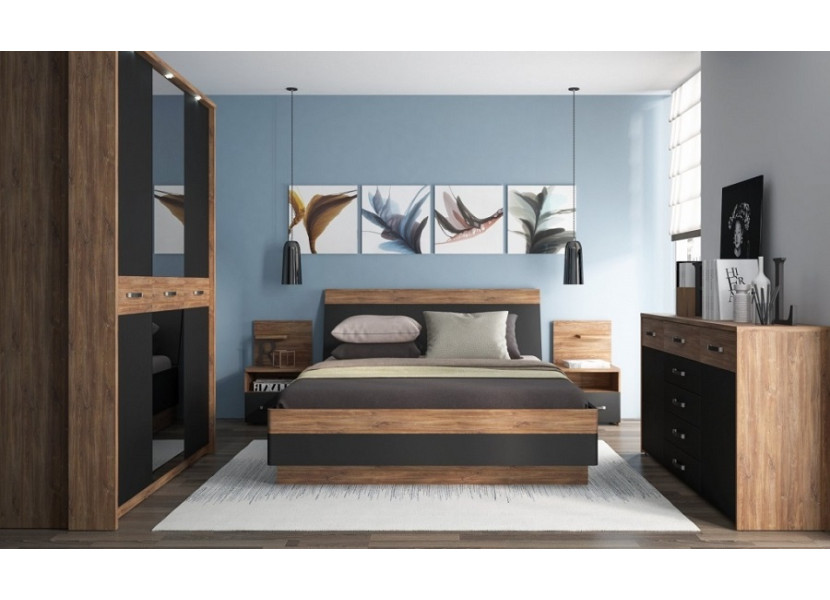 Nábytok ANDORA sa vyrába v elegantnom farebnom prevedení dub stirling jasný/čierna matná. Vybrať si môžete z dvoch typov skríň a postelí s úložným priestorom alebo bez úložného priestoru.