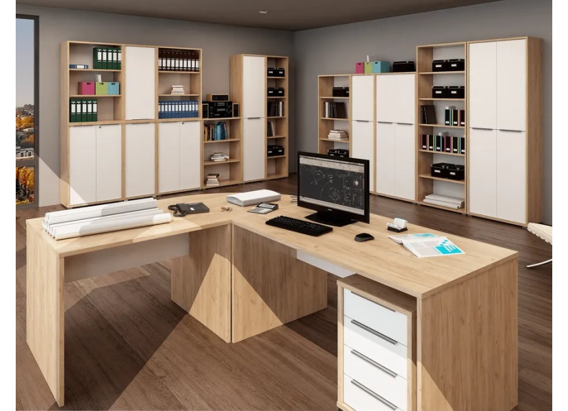 Kancelársky nábytok RIOMA vo farbe dub artisan/biela je kvalitný slovenský výrobok. Korpus skriniek a police sú vyrobené z laminovanej drevotriesky v hrúbke 22m, dvierka majú hrúbku 16mm a kovovú úchytku. Vyb..