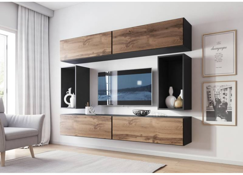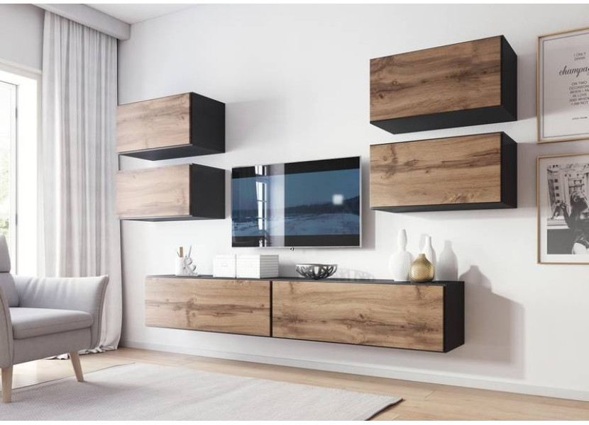 Všetky prvky obývacej steny RAFA sa vyznačujú svojou variabilitou. Sektorové skrinky môžete rozmiestniť ľubovoľne, pretože zostava sa skladá zo samostatných skriniek, ktoré môžete zavesiť v horizontálnom alebo vertik&aa..