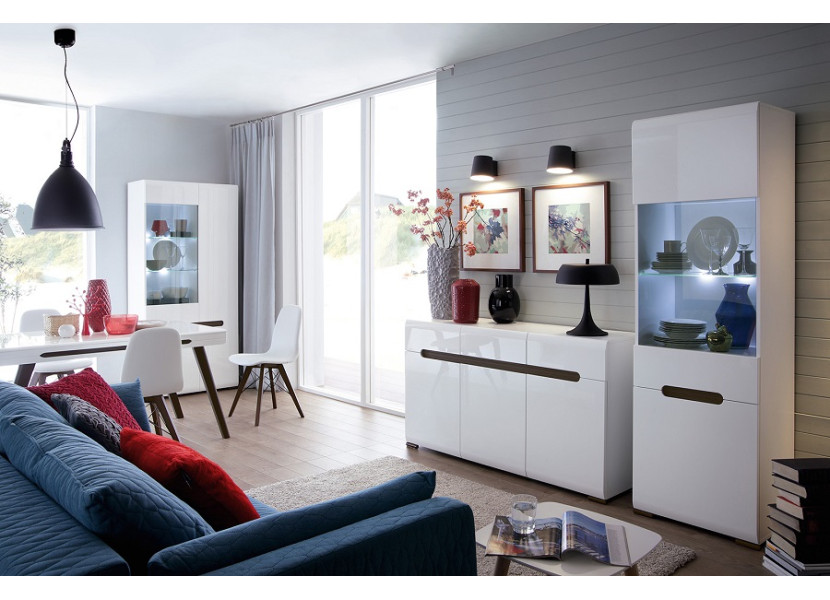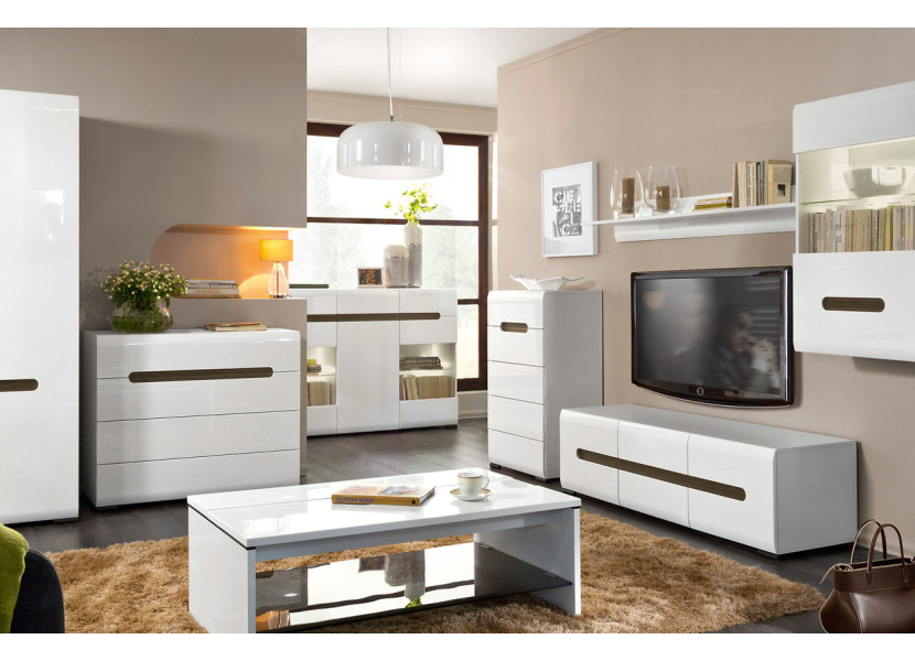 Moderná, jednoduchá a elegantná obývacia stena AZTECA v bielom lesku vytvorí jedinečný interiér. Zaujmú Vás tvarované úchytky a zaoblené hrany na dvierkach.