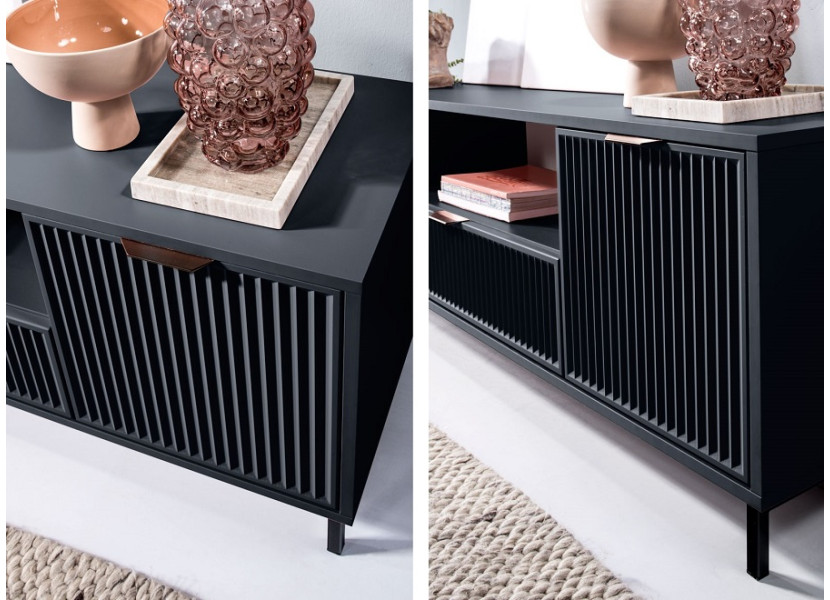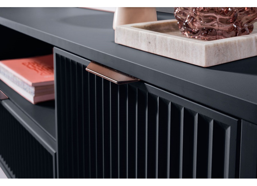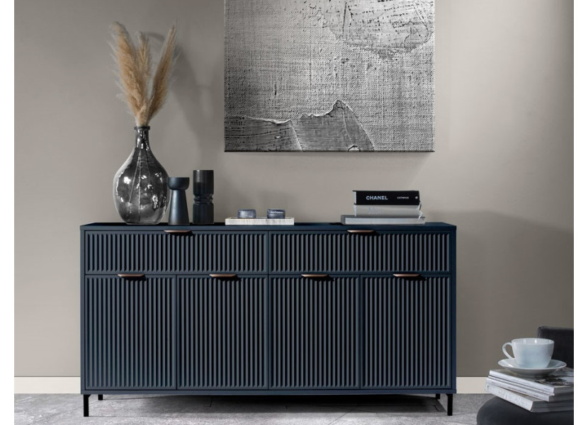 Nábytok LINKaSTYLES vo farbe indigo je vhodný pre ľudí, ktorí radi kombinujú farby a štýly. Nábytok je zdobený vzorom na dvierkach, v podobe frézovaných drážok. Kovové nožičky majú čiernu farbu, úchytky sú v medenom farebnom prevedení.