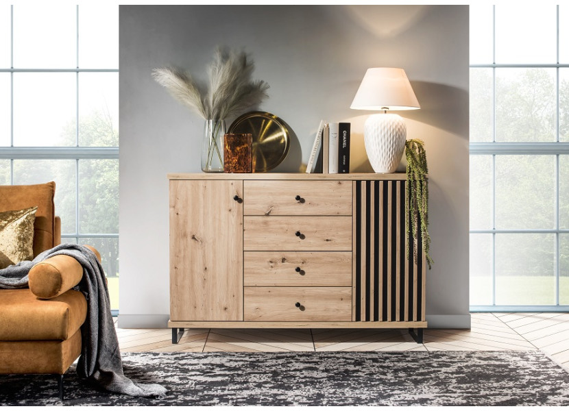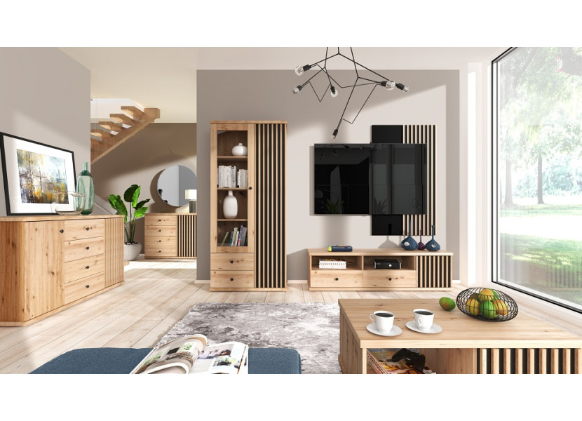 Kolekcia nábytku CALI má zaujímavý dizajn. Je úžasnou kombináciu vertikálnych lamiel na tmavom pozadí, pričom jednu lamelu využíva ako úchytku. Krásne farebné prevedenie sa hodí do každého inter..