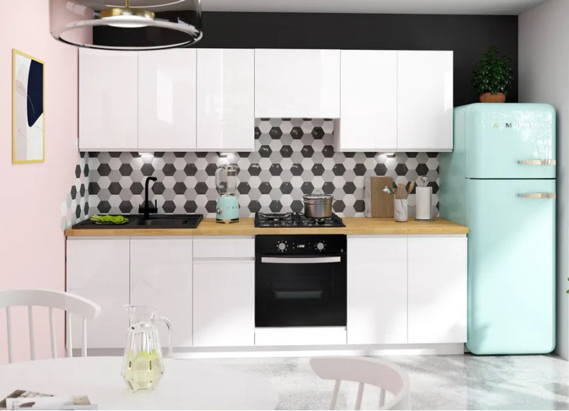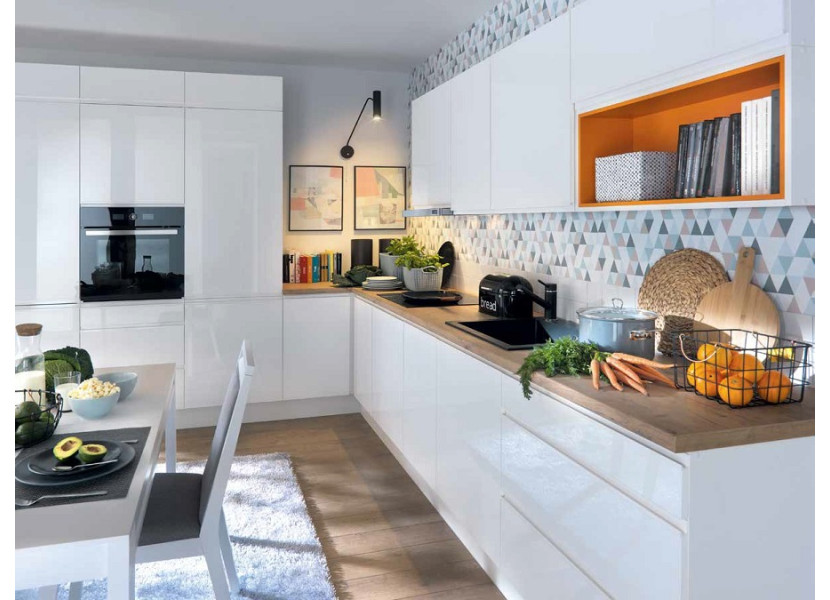 Nová sektorová kuchyňa SOLE vo farbe biely lesk je vhodná pre mladšiu aj staršiu generáciu. Má jednoduché dvierka so zabudovanou úchytkou pozdĺž celej hornej plochy dvierok. Kuchyňa SOLE ponúka množstvo skriniek na zabudov..
