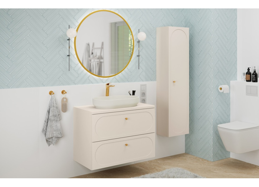 Vysoká policová skrinka do kúpeľne DONNA Sand predstavuje modernú interpretáciu klasického štýlu. Závesná skrinka v šírke 35 cm je vyrobená z laminovanej drevotriesky s ABS hranami a dvierkami z M..