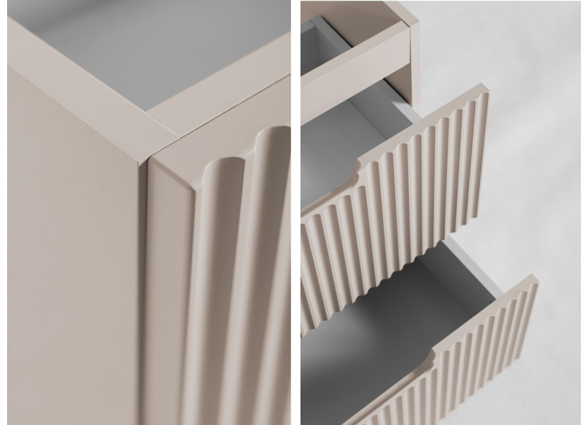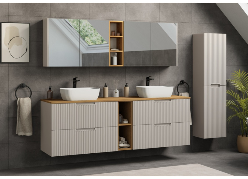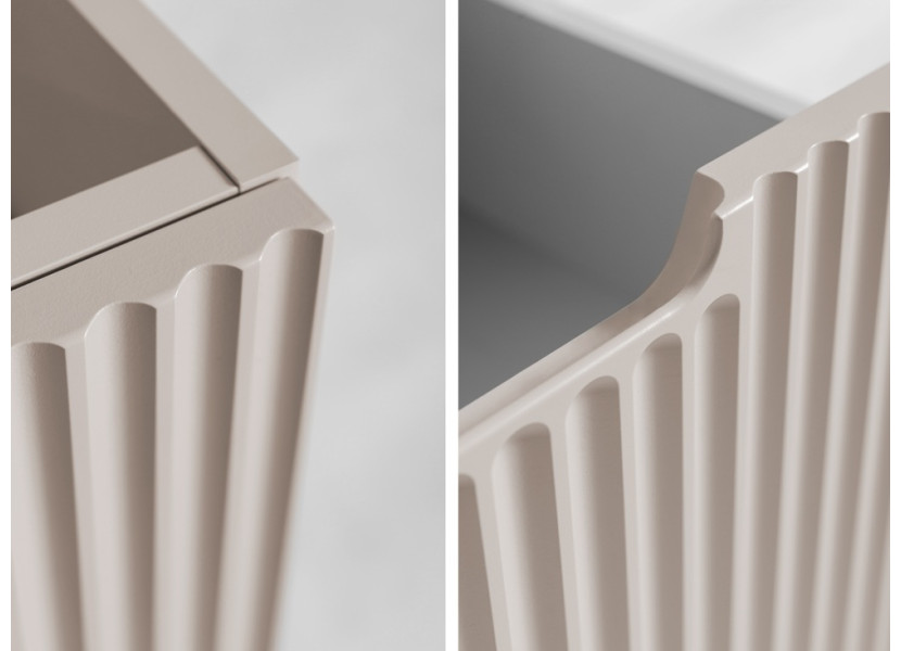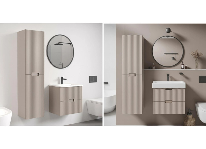 Kúpeľňový nábytok VENA kašmír je moderným riešením pre každého, kto hľadá estetické a praktické skrinky do kúpeľne. Kúpeľňové skrinky sú vyrobené z laminovanej drevotriesky s ABS hranami, pričom predné plochy z MDF materiálu sú zdobené zvislým drážkovaním, dodávajú elegantný vzhľad a zaručujú dlhú životnosť. Súčasťou tejto kolekcie sú skrinky pod umývadlo v šírke od 60 cm do 180 cm, vysoké aj závesné skrinky, všetky v obľúbenom béžovom prevedení kašmír. Praktické zafrézované úchytky sú navyše nielen dizajnovým, ale aj funkčným prvkom.