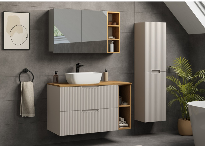 Skrinka pod umývadlo VENA kašmír v šírke 100 cm umožňuje efektívne využitie priestoru. Skladá sa z troch častí: - 80 cm zásuvkovej skrinky pod umývadlo, - 20 cm policového regálu - a 100 cm vrchnej dosk..